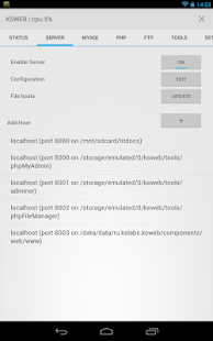 KSLabs team wants to bring to your attention KSWEB – a suite of web developer for Android platform. It consists of: a web server, a PHP programming language, a database MySQL and msmtp for sendmail support. This suite allows you to organize a platform for running and debugging Web applications (sites) in your Android device and You don’t need a root access to run KSWEB. Otherwise, you can start your web server on 80 port. A user friendly interface of KSWeb and our online support leads you to realization of all your web projects. This software is shareware. You have a trial period of 5 days.